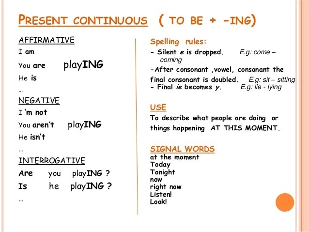 We use the simple present tense when an action is happening right now, or when it happens regularly (or unceasingly, which is why it's sometimes called present indefinite). Terrence isn't working on his project. I'm not kidding with you. present continuous you are playing football now. simple present tense also called present indefinite tense, is used to express general statements and to describe actions that are usual or habitual in nature. We've been going to dance lessons to prepare for the wedding.; What is simple present tense formula. 12 tenses formula with examples lessons for english from lessonsforenglish.com the simple present tense can be combined with several expressions to indicate the time when an action occurs periodically, such as every. The present continuous tense active to passive … 21/07/2021 · in the passive voice of the present continuous tense, we focus on the object (the receiver of the action) that is receiving the action in the present. Maybe you would like to learn more about one of these? She is not making sense. In a sentence, a verb and its form convey the time of the occurrence or the happening. I don't have a car.